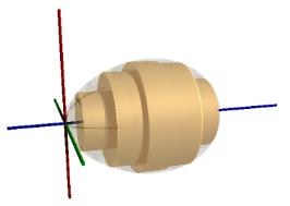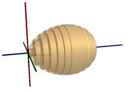 | Man kann sich diesen Rotationskörper in viele dünne Scheiben zerschnitten denken. Diese dünne Eischeiben kann man durch Kreiszylinder approximieren. Der Radius der Kreiszylinder an der Stelle x ist durch den Funktionswert E(x) gegeben. Die Höhe des Zylinders ist der Abstand dx zwischen zwei Zylindern. Die Summe der endlichen Zylindervolumina ist eine Näherung des Eiervolumens. Lässt man die Dicke der Zylinder gegen Null gehen, so erhält man unendliche viele, unendlich dünne Zylinder, deren Volumina aufsummiert exakt das Eiervolumen ergeben. Mathematisch geschieht dies durch die Integration der Kreisscheibenfunktion K(x),